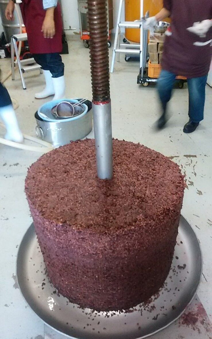 ぶどうの実を 発酵させ 皮と 液体の分離の為 プレスしたら、この通り! ワインの香りも すでに 香っています