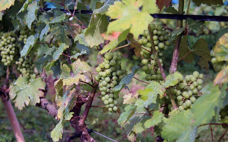 収穫されたブドウの中には、痛んでいる悪い粒もあるので、粒の選果をします。